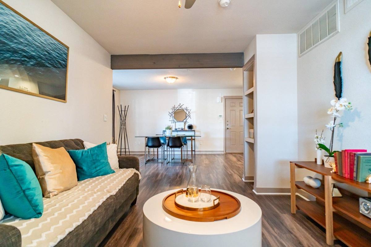 These apartments feature a living room, dining room and a kitchen with standard appliances, standard countertops, a dishwasher and disposal. There are hardwood floors in the kitchen, living room, dining room and the bathroom(s), with carpet in the bedroom(s). There is central A/C and heat and patio or balcony, Unit amenities include high-end fixtures and two-inch wood blinds. Full-sized washer/dryer in select units or washer/dryer connections. Community amenities include fitness center, game room, outdoor lounge with grilling stations, clubhouse, volleyball courts and two sparkling pools. Pets are welcome. Parking pass to access the open parking lot is provided with rent. Located only a seven-minute drive to Interstate-35.